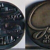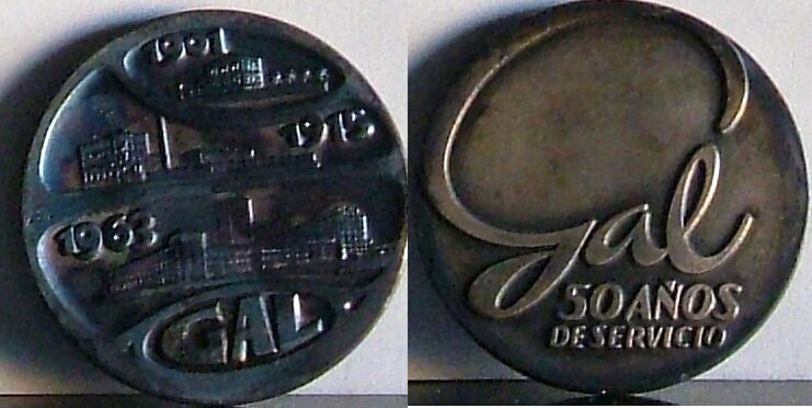 - Fotografía de las caras de una medalla conmemorativa de la Empresa Gal, en una de sus caras entre el rótulo de la marca representativa con diferentes edificios que van aumentado de tamaño simulando el crecimiento de la empresa en los distintos años, junto al logotipo de la marca y los años de aniversario.