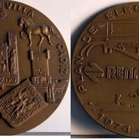 Fotografía de las caras de la medalla representativa del plan de electrificaciones llevado a cabo en los años 1974-1976, en el anverso los escudo correspondientes a las ciudades de Huelva, Cádiz y Sevilla junto a la representación de la estructura interna de algún sistema eléctrico.Medaslla anverso y reverso realizada por encargo de Renfe. Otros archivos: Mbo/368