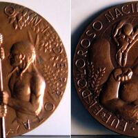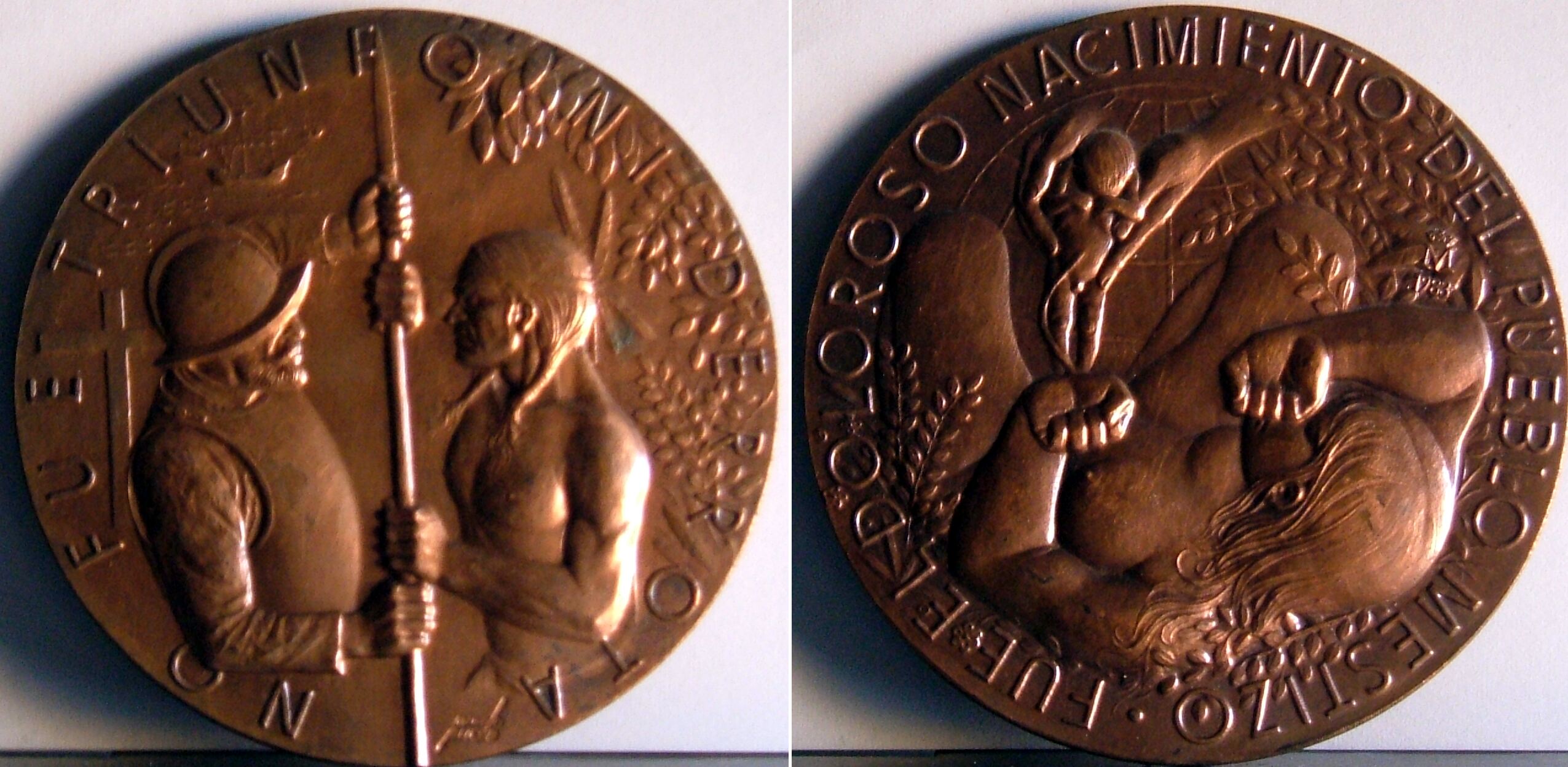 Fotografía de las caras de una medalla, en una de ellas se aprecia la leyenda “fue un triunfo y una derrota” con la imagen de un saldado español y un indígena contrarrestando sus fuerzas a través de una lanza que los dos sujetan con fuerza, junto a la imagen de una mujer dando a luz que es cogido por unas manos junto a la leyenda que dice”fue un nacimiento doloroso del pueblo mestizo”.Presentada para el concurso de Isidro Cistaré en Barcelona. Premiada!