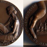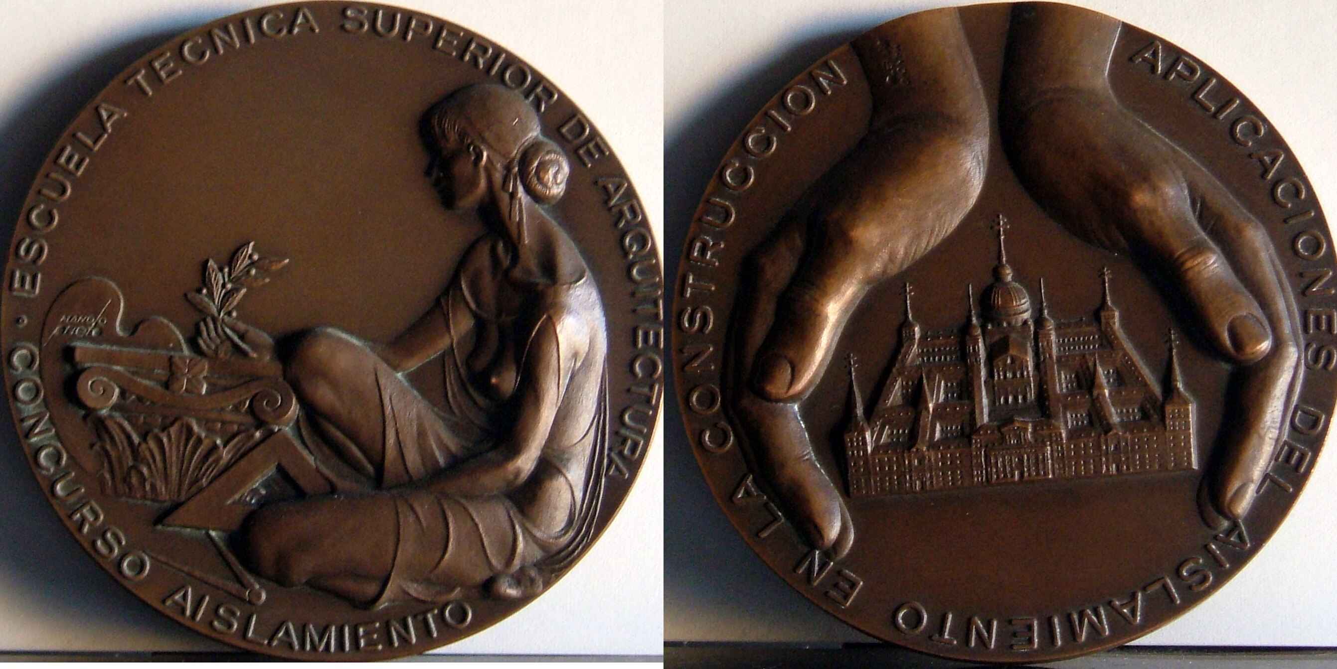 Fotografía de una medalla representativa de la Escuela Superior de Arquitectura, con la imagen de una mujer de perfil sentada con un traje semitransparente que deja ver tras sus pliegues su cuerpo desnudo, sujetando en su mano una rama de laurel junto a la leyenda inscrita en el perfil de la medalla, en el reverso se aprecia unas manos que cobijan el monumento arquitectónico Real Monasterio de San Lorenzo de El Escorial junto a la leyenda correspondiente.Para Cristaleria Española, S.A. anverso y reverso. Otros Archivos MBO/579-580