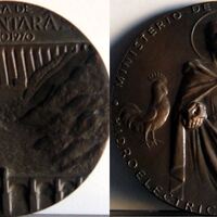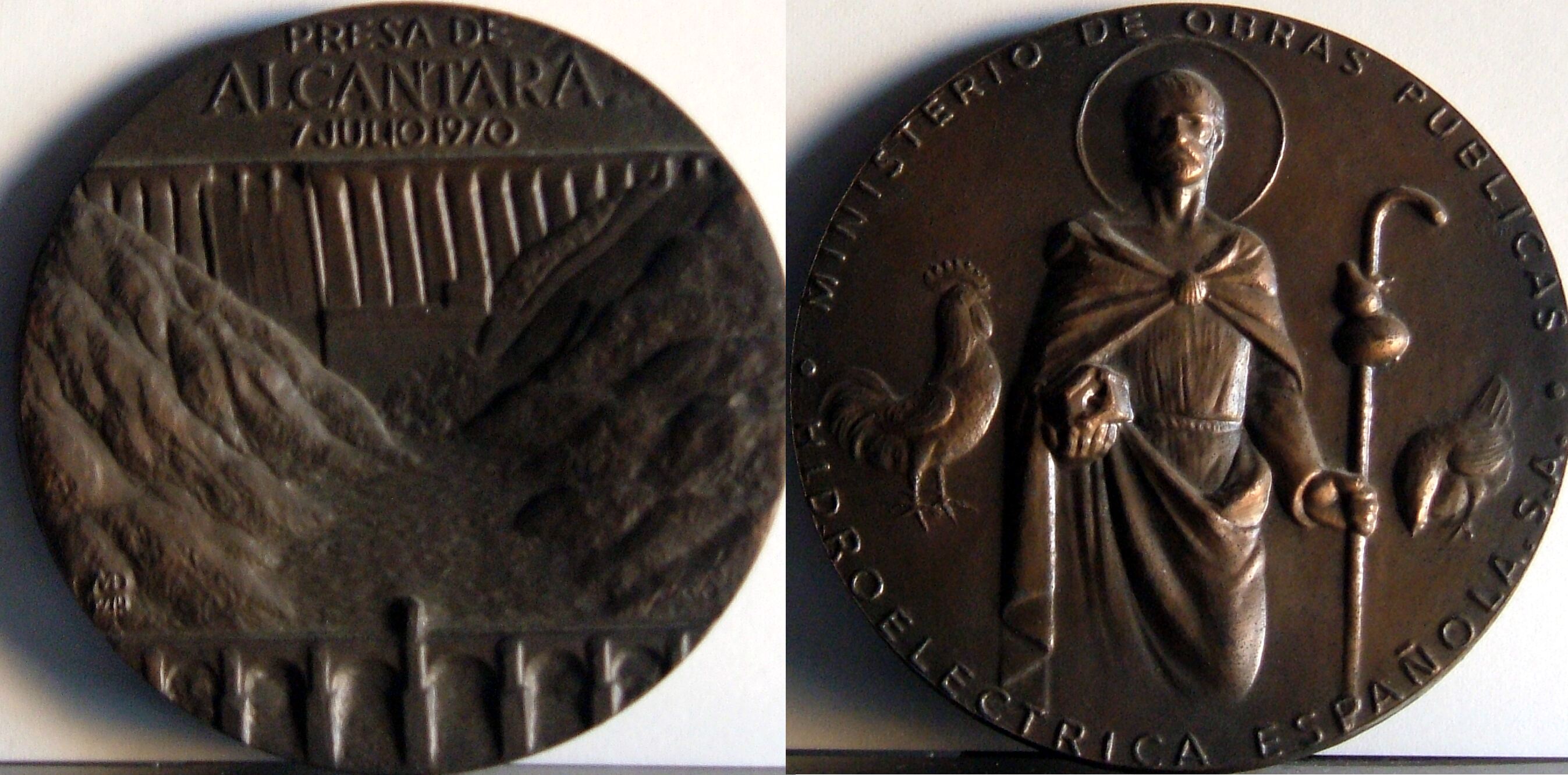 - Fotografía de los bajorrelieves de una medalla, donde en una de sus caras se aprecia la presa de Alcántara junto a la figura de Santo Domingo de la Calzada junto a unos gallos patrón de los ingenieros de caminos.