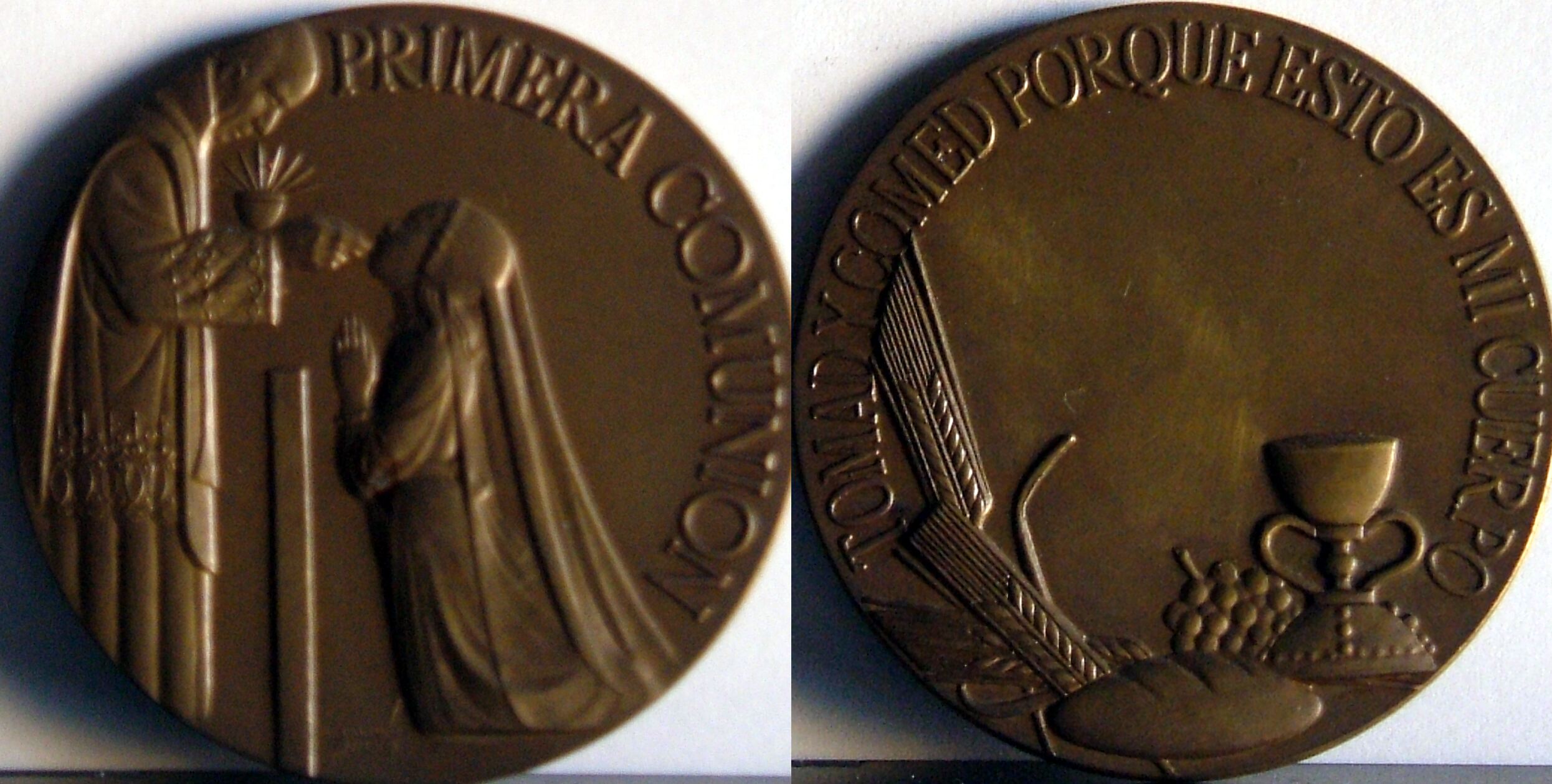 - Fotografía de las caras de una medalla representativa de la Primera Comunión, con la escena de un sacerdote dando a una niña de rodillas su Primera Comunión, junto al reverso donde se representan los elementos principales de la Comunión, con la frase eucarística en el perfil de la medalla.Otros archivos: Mbo/344