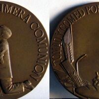 - Fotografía de las caras de una medalla representativa de la Primera Comunión, con la escena de un sacerdote dando a un niño de rodillas su Primera Comunión, junto al reverso donde se representan los elementos principales de la Comunión, con la frase eucarística en el perfil de la medalla.realizadaparaNumismatica Iberica Otros archivos. Mbo/343