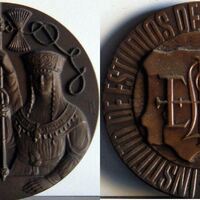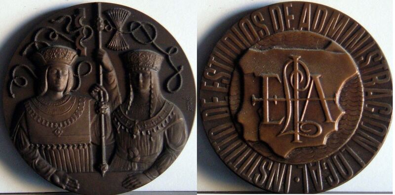 - Fotografía de las caras de una medalla, donde en el anverso se aprecia en primer término las figuras de Los Reyes Católicos sujetando un vástago largo junto a un mapa de España con unas siglas en el centro rodeado por la leyenda correspondiente.Por encargo del Sr. Corral. Otros Archivos: MBO/459 ; MG/1543 -1545
