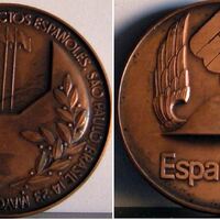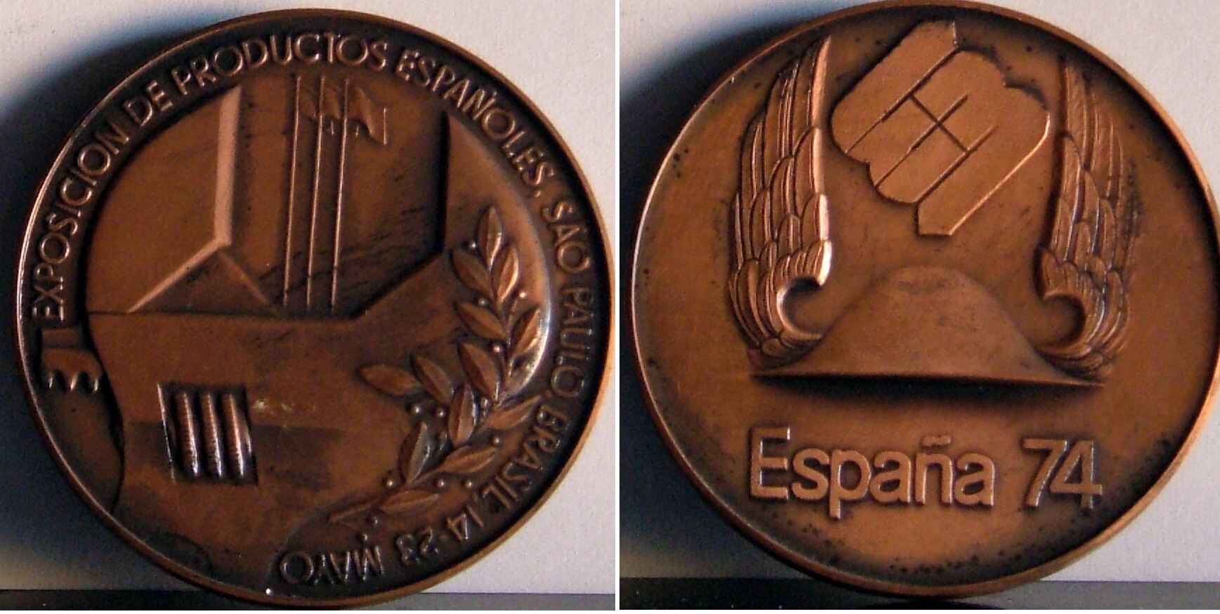 Fotografía de las caras de una medalla conmemorativa de la exposición de productos o en Sao Paulo, con la imagen de una llave inglesa de cuya abertura salen tres banderas con largos mástiles, junto al reverso donde se aprecia en el centro un casco alado con un logotipo encima y las letras España 74.anverso y reverso de lamedalla reproducida en bronce. Otros archivos: MBO/602