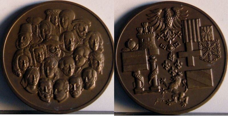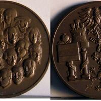 - Fotografía de las caras de una medalla, en cuyo anverso se representa un conjunto de retratos de personajes ilustres que ocupan todo el campo de la medalla junto al reverso con los diferentes elementos iconográficos de un escudo.
