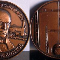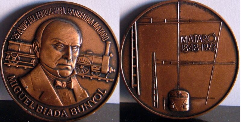 - Fotografía de las caras de la medalla representativa del 25 Aniversario del ferrocarril Barcelona y Mataró, con el retrato de Miguel Biada Bunyol junto a la silueta de la cabecera de un tren avanzando por los raíles y estructura ferroviaria.