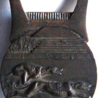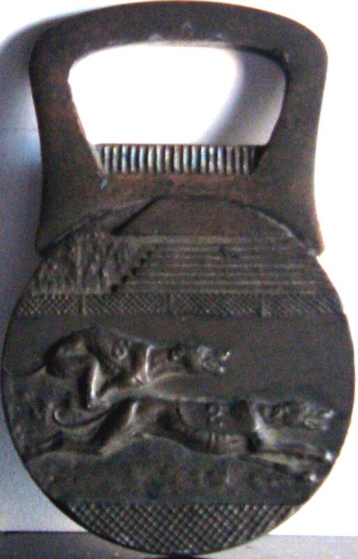 - Fotografía de un abrebotellas metálico con una escena que representa a dos galgos corriendo en plena carrera donde de fondo se aprecia las gradas del recinto donde se celebra.