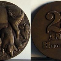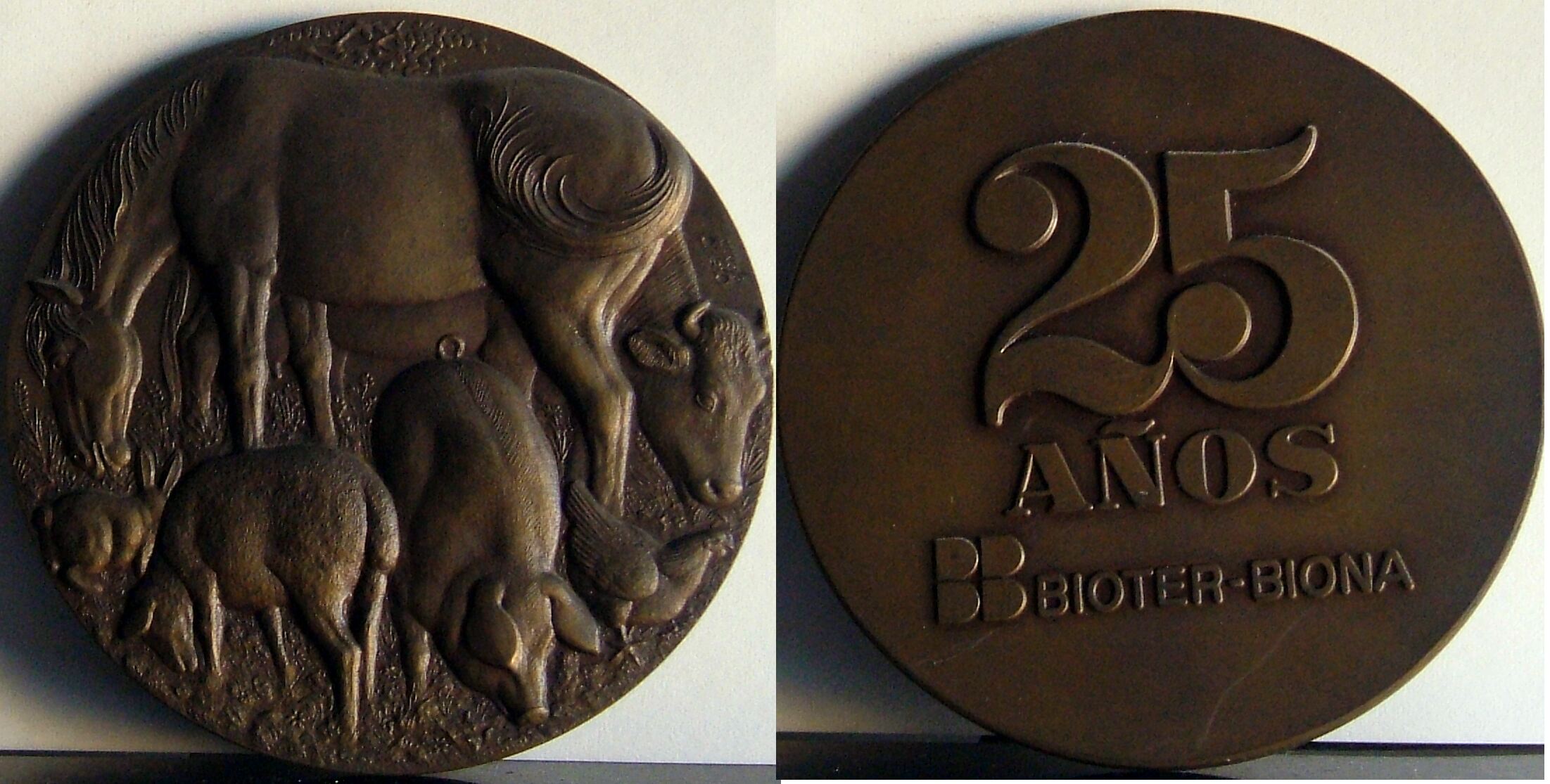 - Fotografía de las caras de una medalla conmemorativa de los 25 años de Bioter -Biona, en cuyo anverso se aprecia un grupo formado por animales representados en distintas posiciones, junto al logotipo y los números conmemorativos de la marca representada.realizada para Bioter Biona, SA. Anverso y reverso. Otros archiivos: MBO/571-572