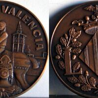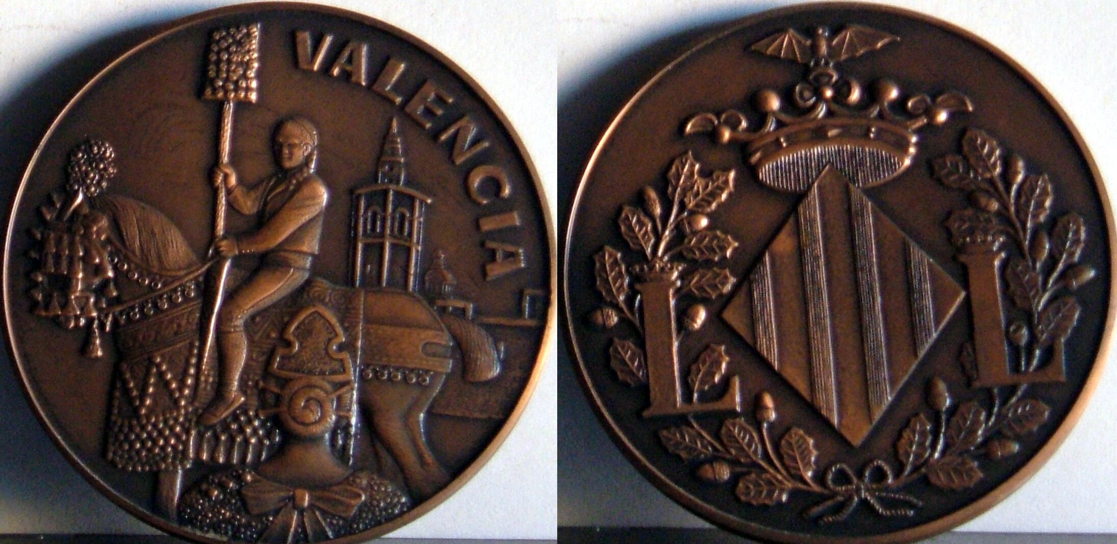 - Fotografía de las caras de una medalla conmemorativas de Valencia, en el reverso se aprecia a una fallera de espaldas frente a un hombre vestido con el traje típico valenciano sobre un caballo engalanado, junto al reverso donde se representa el escudo de valencia franqueado por dos L y contorneado por una corona de laurel.
