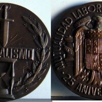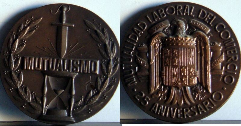 - Fotografía de las caras de una medalla conmemorativa del 25 aniversario de la Mutualidad Laboral y del Comercio representado en una de sus caras por el escudo imperial junto a la otra cara donde se aprecia un puñal encima de la palabra “mutualismo” y debajo un reloj de arena.
