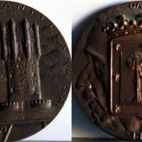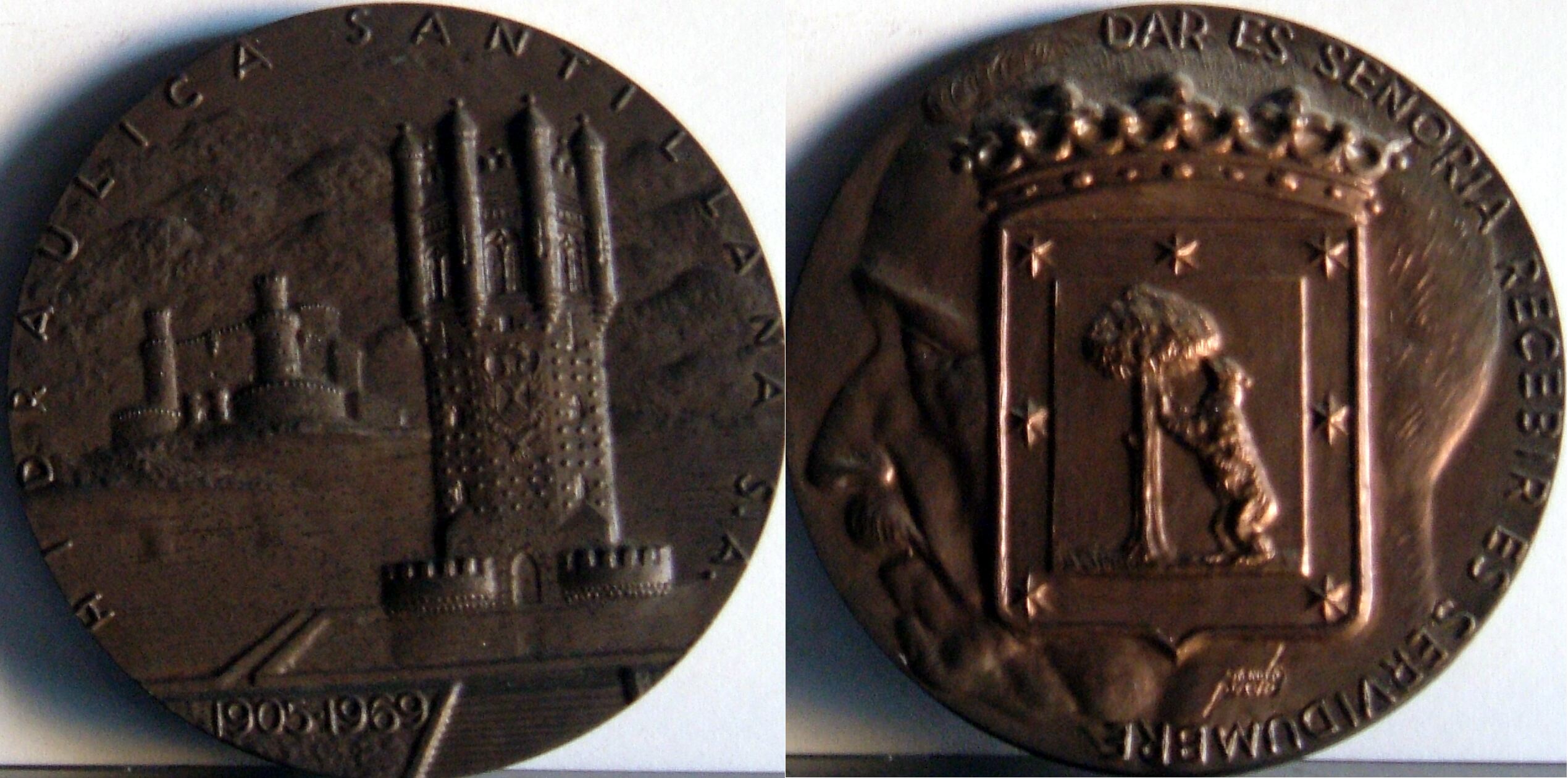 Fotografía de las caras de una medalla representativa de Hidráulica Santillana s.a., con la imagen en primer término de una torre de avanzada en cuyo fondo se aprecia las murallas de un castillo fortificado, junto al reverso donde se representa el escudo de Madrid superpuesto en el perfil del General Franco, junto a la leyenda “Dar es señoría recibir es servidumbre”.Otros archivos: MBO/392