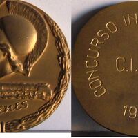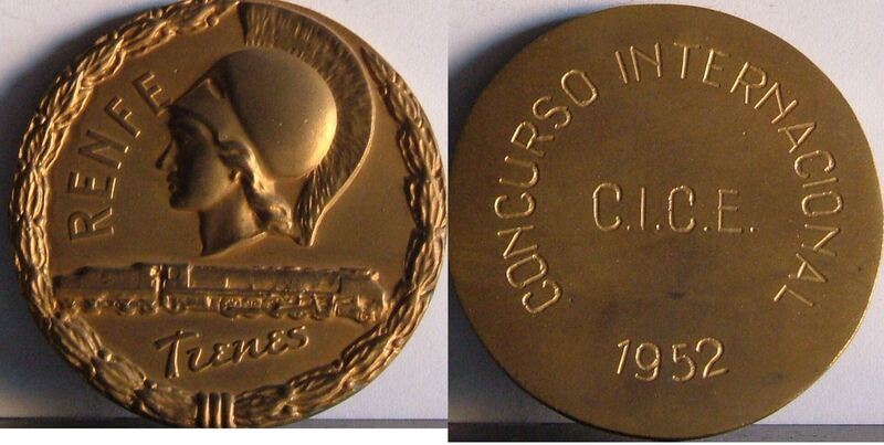 - Fotografía de las aras d una medalla representativa del concurso internacional de C.I.C.E celebrado en el año 1952, con el retrato de perfil de un hombre con casco romano y la silueta de un tren.