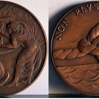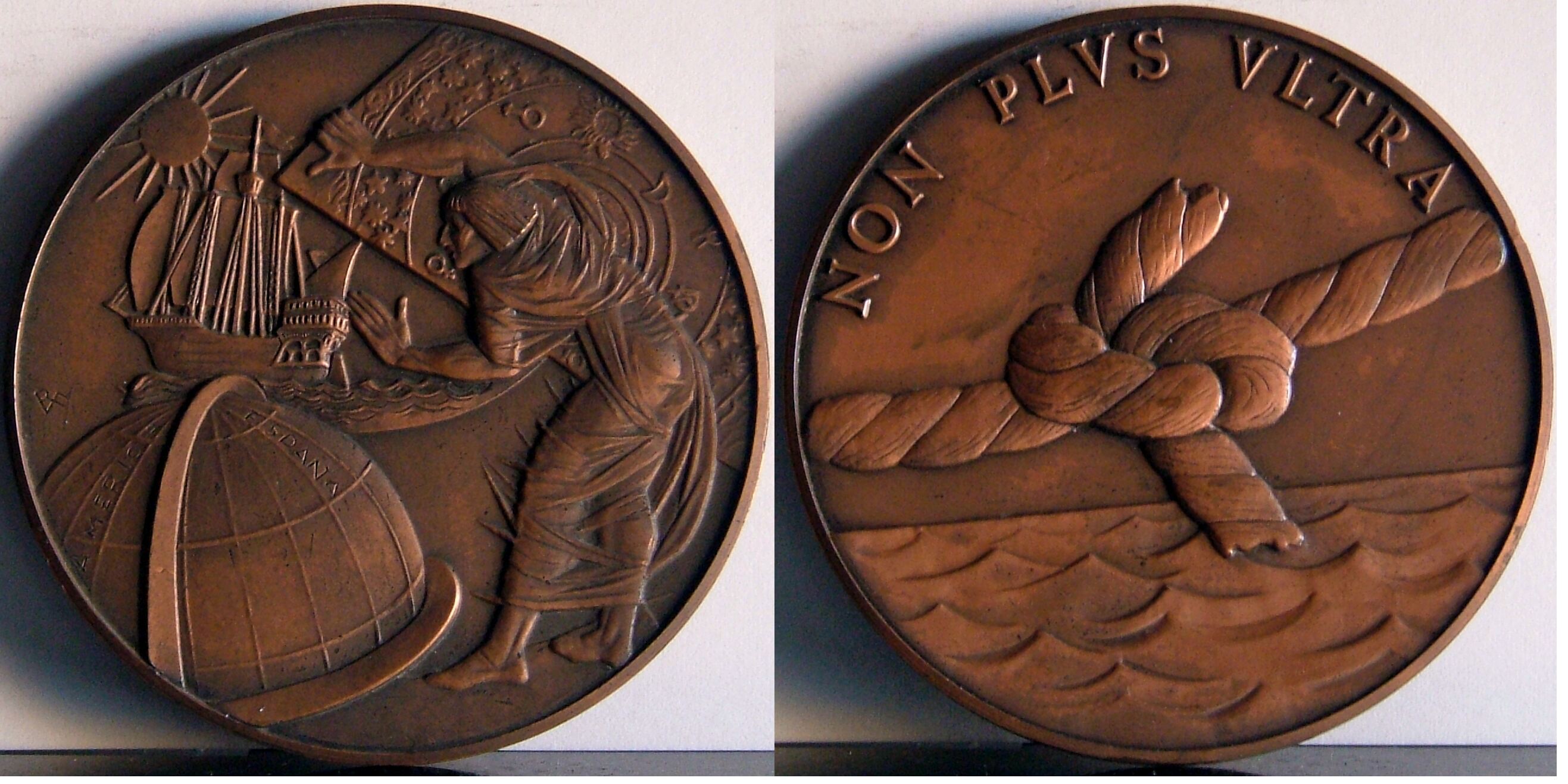 - Fotografía de las caras de una medalla en cuyo anverso se aprecia a un hombre sujetando un mapa cartográfico junto a una bola del mundo y un barco, en el reverso un nudo marinero en el centro de la escena sobre el oleaje del mar y la leyenda “Non Peus Ultra”.