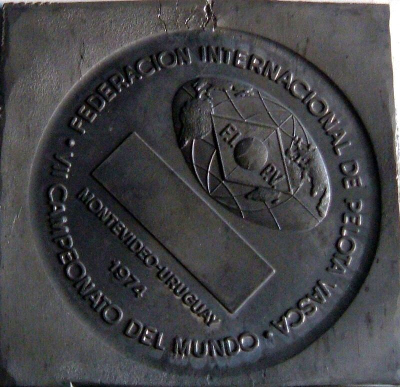 - Fotografía de la cara de una medalla conmemorativa del Campeonato del mundo de Pelota Vasca cuya leyenda se encuentra en el perfil de la medalla en el centro una bola del mundo con una pelota y debajo una cartela rectangular vacía.