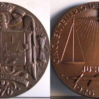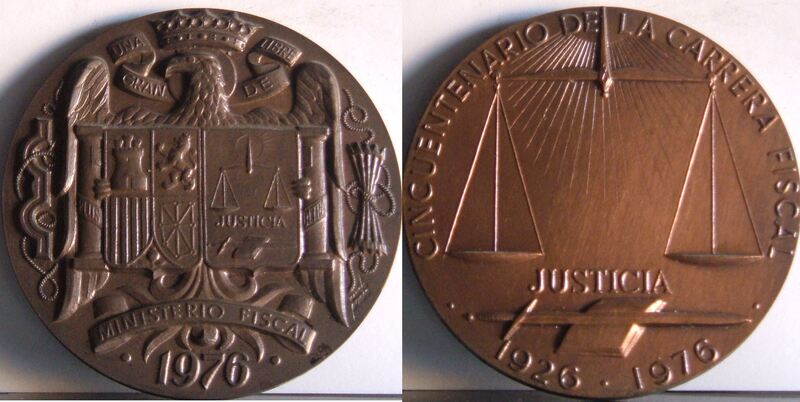 - Fotografía de las caras de la medalla conmemorativa de los cincuenta años de la carrera fiscal cuya leyenda aparece inscrita en el perfil de la medalla con una balanza y en la otra cara un escudo sobre el águila imperial.Otros archivos Mbo/ 374 8anverso)