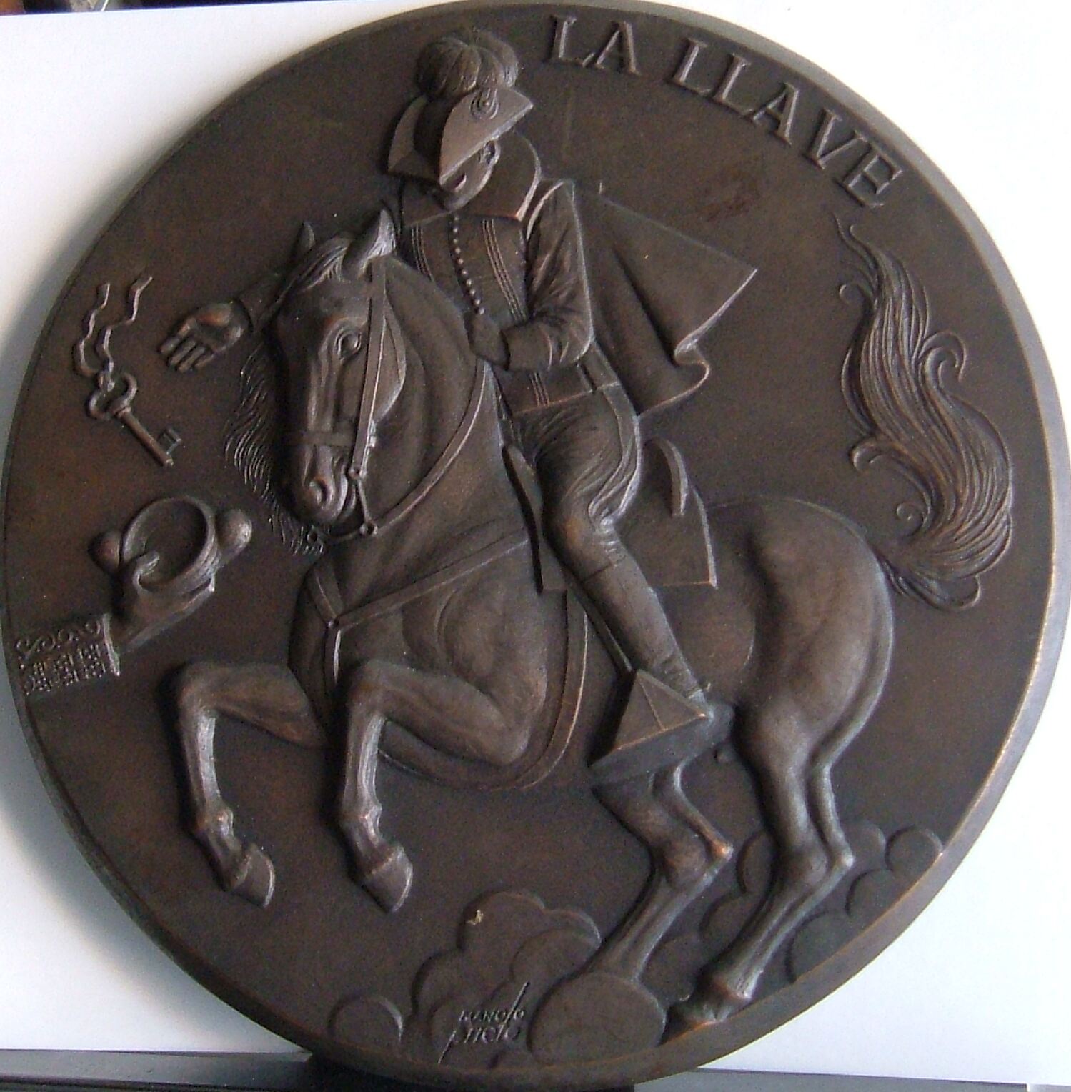 - Fotografía del bajorrelieve de la cara e una medalla con la figura de un alguacil, a caballo, echando la llave de la plaza en la montera de un torero del que sólo divisamos la mano.2ª Tauromaquia. OTROS ARCHIVOS. MBO/290.4 MEN/1594