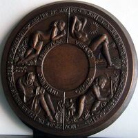 - Fotografía del bajorrelieve de la cara de una medalla donde se representa las estaciones en secciones divididas entorno un círculo central con las figuras de cuatro mujeres con diferentes iconografías correspondientes a cada estación.