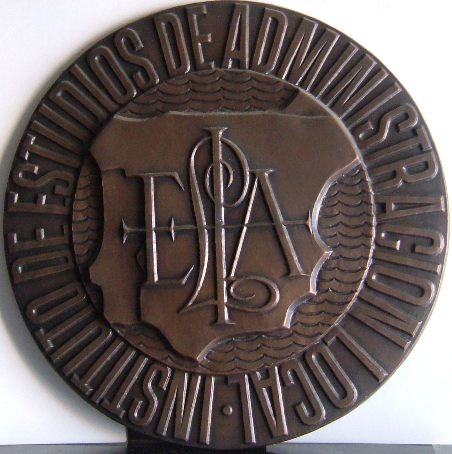 Fotografía de un bajorrelieve de la medalla representativa del Instituto de Estudios de Administración Local con la silueta del mapa geográfico de España con unas siglas en el centro y la leyenda correspondiente ocupando el perfil de la medalla.Realizado por encarbgo del sr. Corral Reverso dem la medalla Otros Archivos: Mbo/459; MG/ 1545; MBr/1486