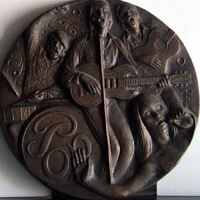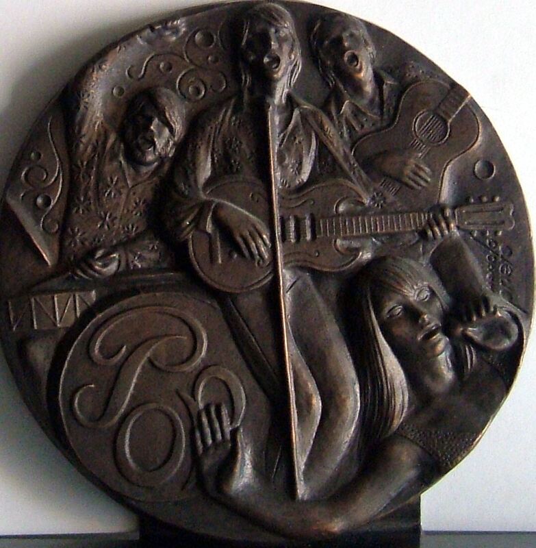 - Fotografía del bajorrelieve de una medalla que representa al grupo mítico inglés Los Beatles que revolucionaron el panorama musical de la época, en primer término la cabeza de una de sus fans y detrás el vocal con una guitarra junto al batería y otro guitarristas.Serie de Manolo Prieto Anverso Baile Pop Otros archivos: Mbo/354 MEN/1828 MEP/1747 MG/1741. Esta medalla fuew espuesta en Exposiciones realizadas por laFIDEM