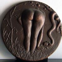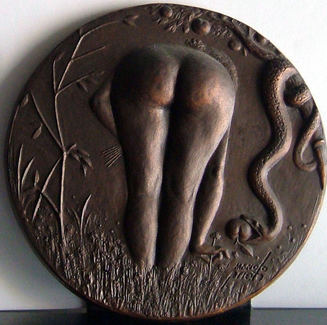 - Fotografía del bajorrelieve de una medalla que representa la escena de Eva desnuda en el paraíso, agachada para recoger algo del suelo, rodeada por la vegetación frutal del paraíso. En un lateral, la figura de la serpiente que baja sibilinamente con una manzana en su boca.