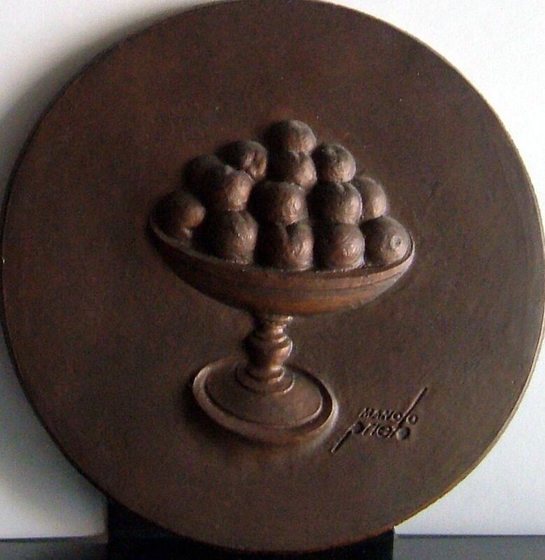 - Fotografía de un bellísimo bajorrelieve de una medalla donde se aprecia muy centrado en la medalla un sencillo frutero lleno de un tipo de fruta, que, aunque no lo podemos asegurar, pensamos que son manzanas.