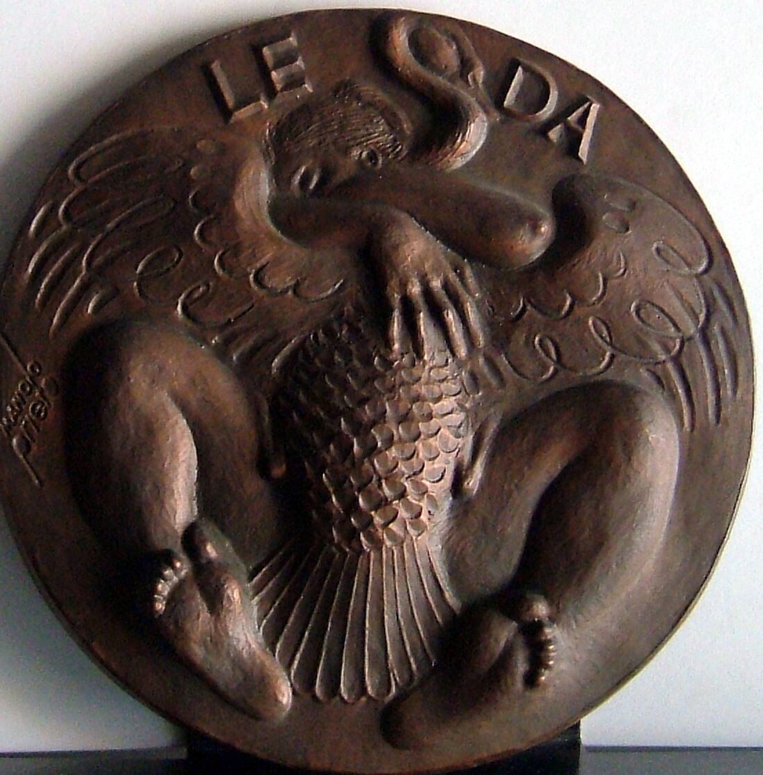 - Fotografía del bajorrelieve de una medalla que representa la escena mitológica de Leda, en el momento menos representado el arte, normalmente, como es el cisne (Júpiter) fundiéndose amorosamente con la joven.