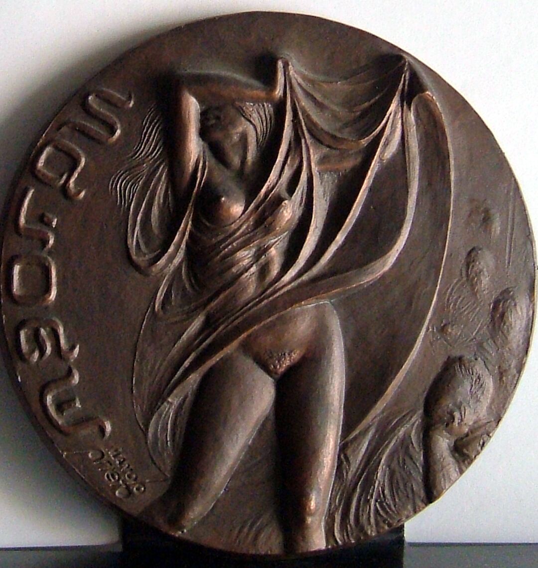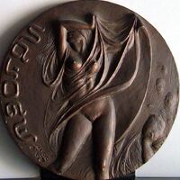 - Fotografía del bajorrelieve de una medalla que representa la escena junto a una epigrafía móvil, del baile de una mujer (Salomé) que se levanta sus vestidos hasta medio cuerpo dejando ver su cuerpo desnudo con un movimiento sensual.Anverso de la medalla Salomé Otros archivos: Mbo/355v MOP/1734 MEN/1832 MG/1739. Serie de medallas realizadas por Manolo Prieto para exposciones con la FIDEN