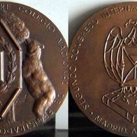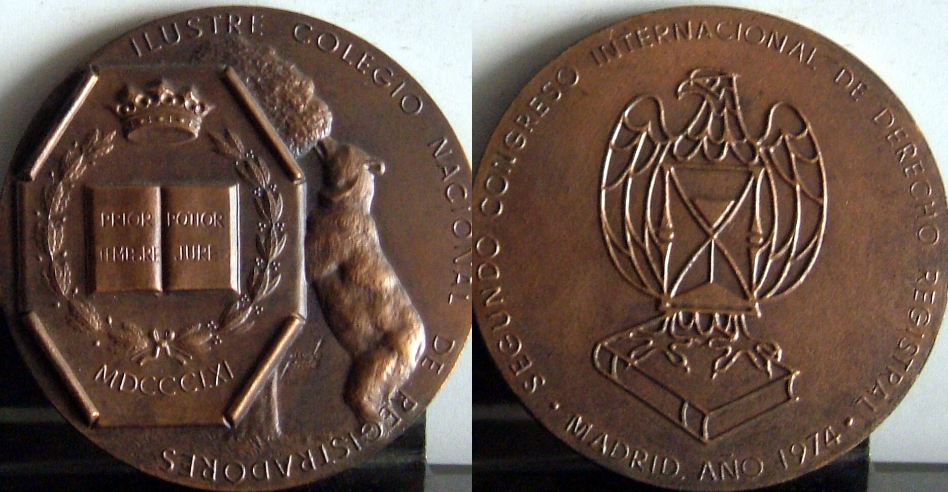 Fotografía de las caras de una medalla representativa del Ilustre Colegios Nacional de Registradores, con la imagen de un oso encaramado a un madroño donde en primer término está superpuesto un octágono con un libro abierto con inscripciones y rodeado por una corona de laurel, a su lado la otra cara donde se aprecia las silueta contorneada de un águila con un reloj de arena y bajo sus patas un libro.Otros Archivos: Mbo/367