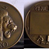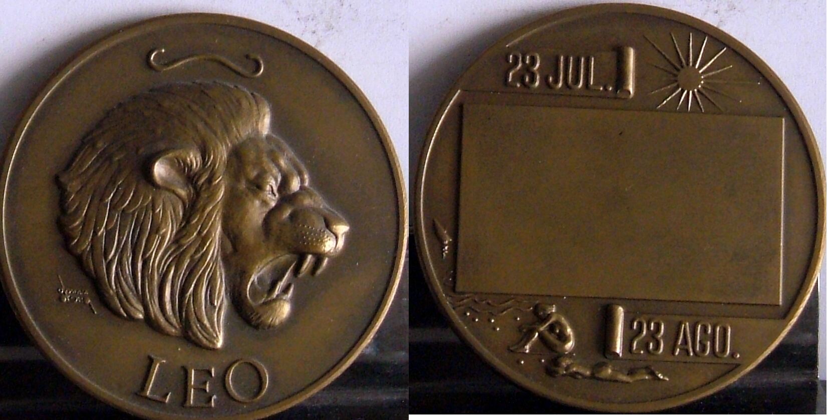 - Fotografía de las caras de una medalla representativa del signo del zodiaco Leo, con la imagen de la cabeza de perfil de un león con la boca abierta rugiendo, junto al reverso donde se aprecia un rectángulo vacío en mitad de la medalla junto a las cartelas con las fechas de dicho signo con un sol y unas bañistas en la playa.