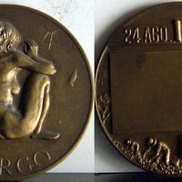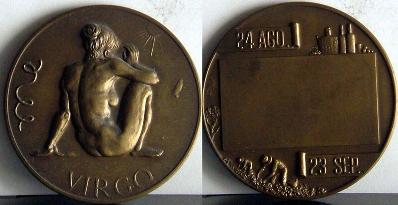 - Fotografía de las caras de una medalla representativa del signo del zodiaco Virgo, con la imagen de una mujer desnuda de espaldas desnuda, junto al reverso donde se aprecia un rectángulo central con las fechas correspondientes al signo junto a unas botellas de vino y la escena de unos hombres en la recogida de la uva.