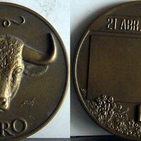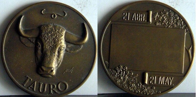 - Fotografía de las caras de una medalla representativa del signo del zodiaco Tauro, con la imagen de la cabeza de una vaca, junto al reverso donde se aprecia un rectángulo central con las fechas correspondientes al signo rodeada de decoración floral representado la primavera.