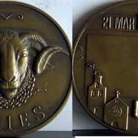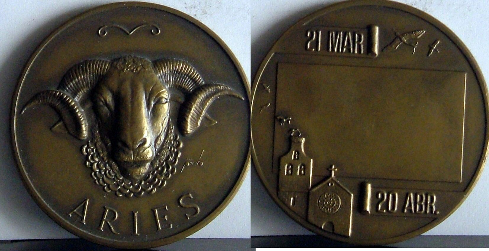 - Fotografía de las caras de una medalla representativa del signo del zodiaco Aries, con la imagen de la cabeza de un carnero, junto al reverso donde se aprecia un rectángulo central con las fechas correspondientes al signo con la imagen de unas iglesias donde regresan las aves del duro invierno.