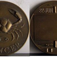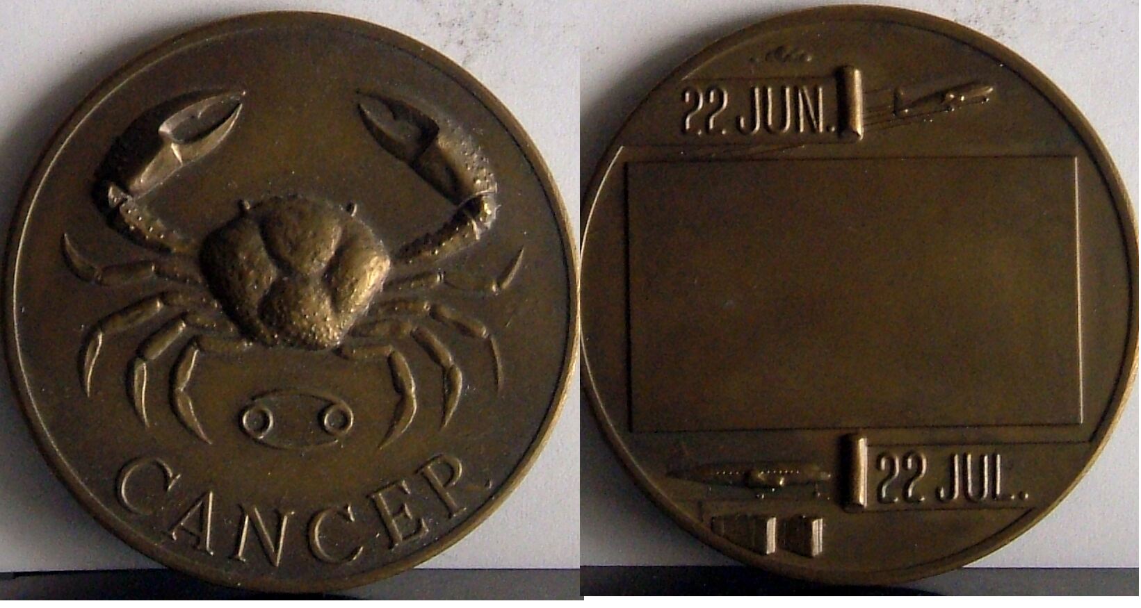 - Fotografía de las caras de una medalla representativa del signo del zodiaco Cáncer, con la imagen de un cangrejo, junto al reverso donde se aprecia un rectángulo central con las fechas correspondientes al signo.