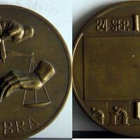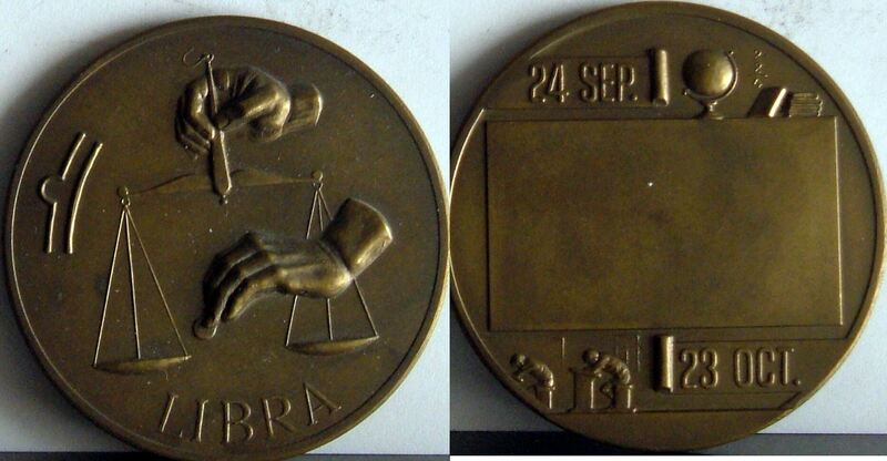 - Fotografía de las caras de una medalla representativa del signo del zodiaco Libra, con la imagen de una balanza sostenida por unas manos que depositan una moneda en uno de los platos, junto al reverso donde se aprecia un rectángulo central con las fechas correspondientes al signo y la escena de unos niños en sus pupitres en el inicio del curso.