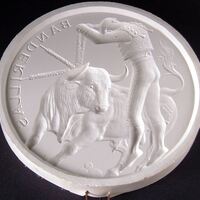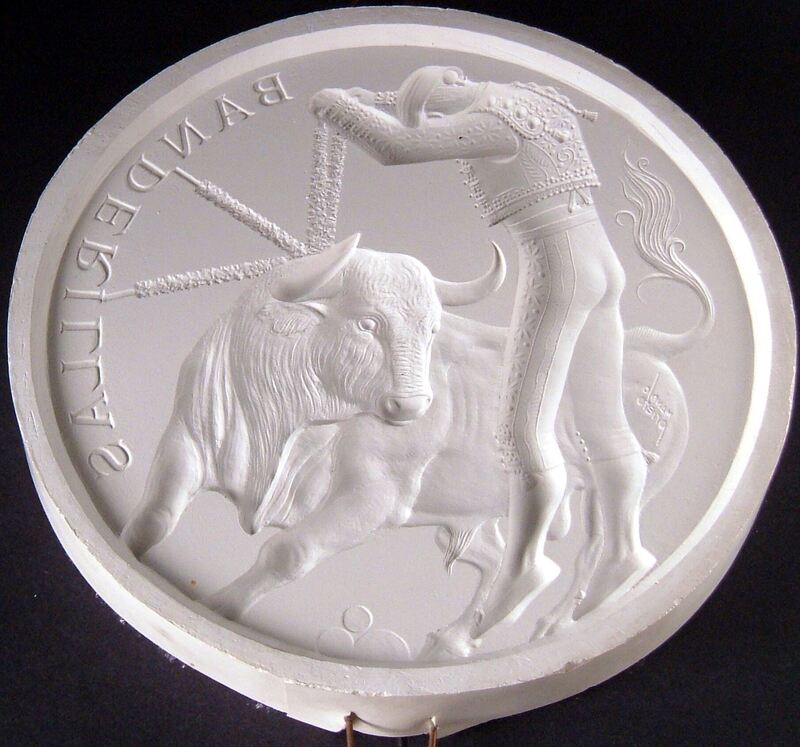 - Molde de escayola del negativo de la medalla Banderillas, con la imagen de un banderillero en el momento de poner las banderillas a un toro que parece buscarle con la mirada.2ª Tauromaquia. OTROS ARCHIVOS: MBO/ 282.6 MG/1407