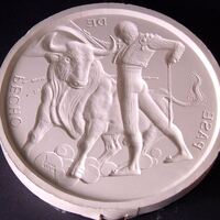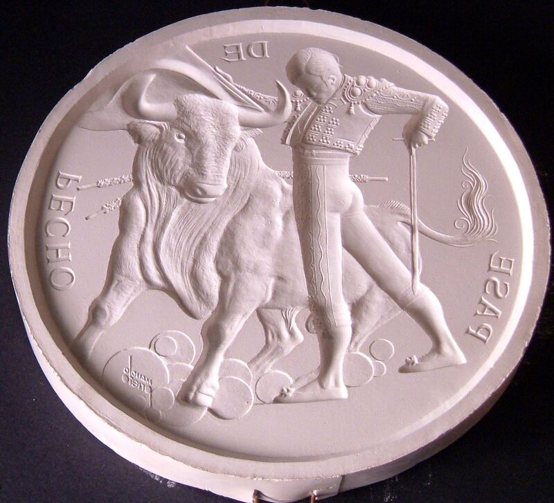 - Molde de escayola del negativo de una medalla que representa el pase de pecho del torero. La elegante postura de éste se contrarresta con la homérica figura del animal que surge como de su pecho.2ª Tauromaquia. OTROSARCHIVOS. MBO/282.1 MG/1401