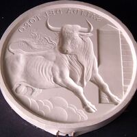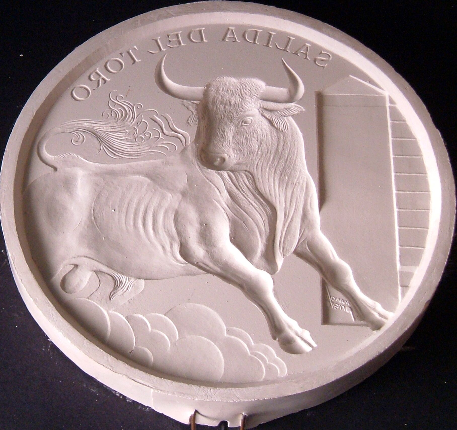 - Molde de escayola del negativo de una medalla que representa a un toro que sale de los toriles con fuerza a la arena del ruedo. La imagen del animal tiene la fuerza icónica de un tótem.Otros archivos: MBO/290.Img.3 MG/1405