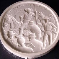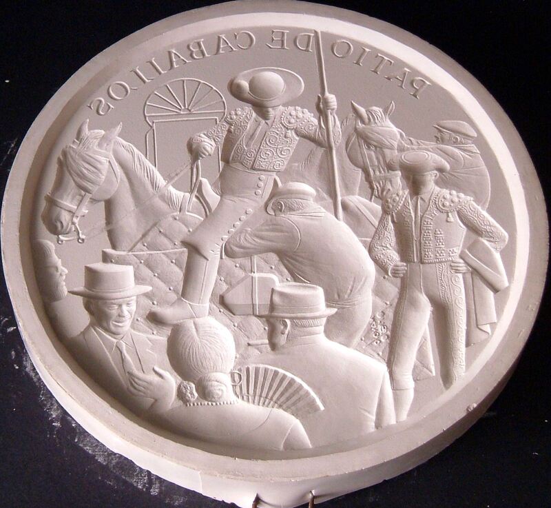 - Molde de escayola del negativo de una medalla que representa la escena en un patio de caballos, en primer término una mujer de espaldas con un abanico conversando con unos hombres y en un segundo plano un picador a caballo junto a un torero y otros personajes.2ª Tauromaquia. OTROS ARCHIVOS: MBO/290.3 MG/1405