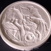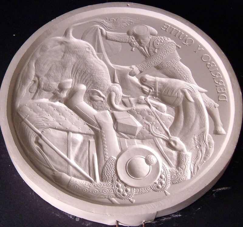 - Molde de escayola del negativo de una medalla que representa la escena taurina del derribo de un picador y su caballo sobre la arena por la embestida del toro donde sale al quite un torero para salvar la situación.2ª Tauromaquia OTROS ARCHIVOS- MO/290.2 MG/1408