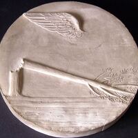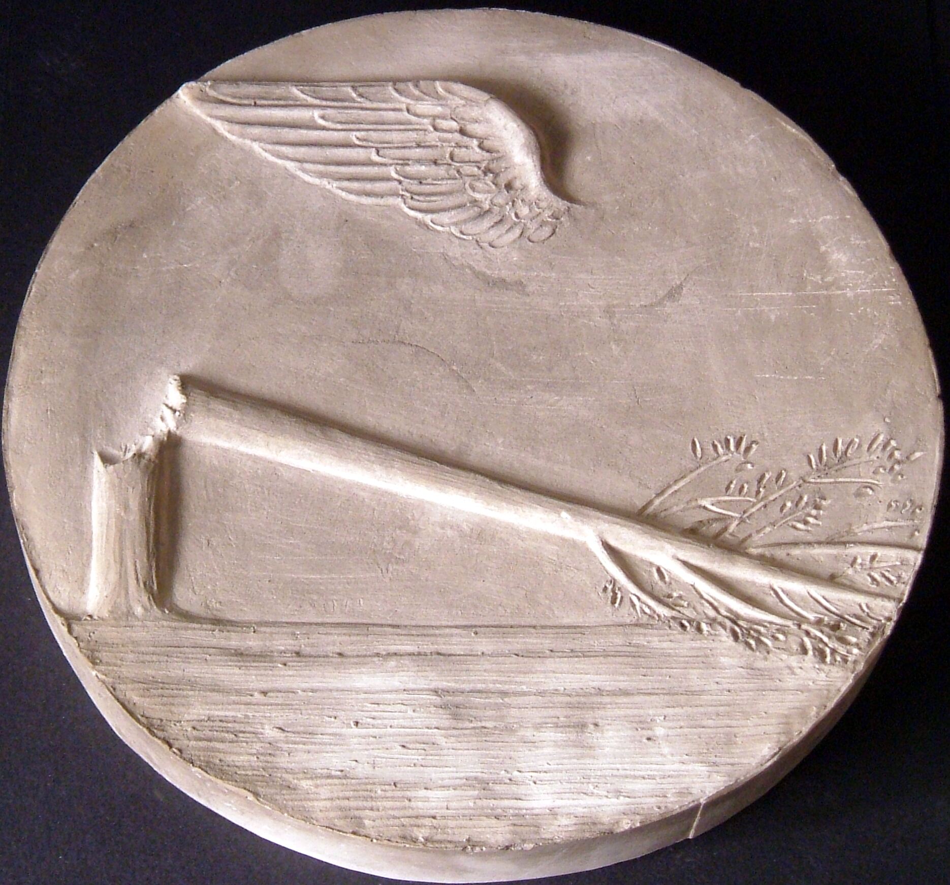 - Molde de escayola del positivo de una medalla que representa la escena de un árbol que cae al suelo derribado por la fractura presentada en el tronco y la figura de un ala que sale del cielo.