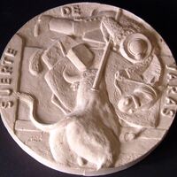 - Molde de escayola del positivo de una medalla que representa la escena taurina, vista desde arriba, de un picador sobre su caballo castigando con su pica al toro. Pueden leerle las letras: “Suerte de Varas”.