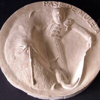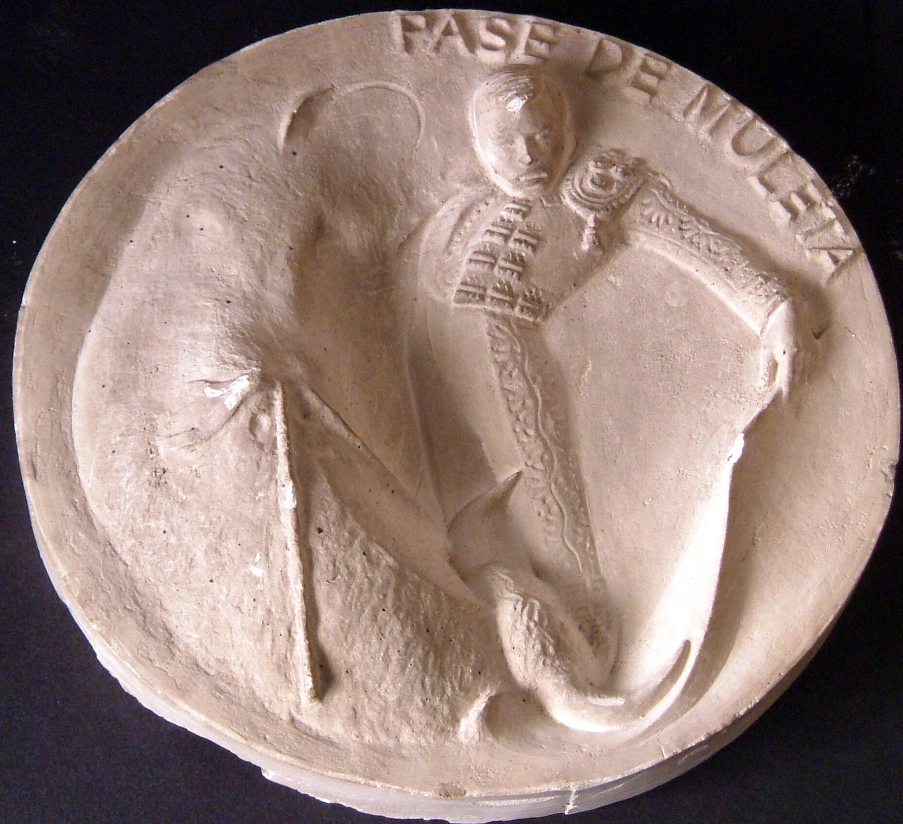- Molde de escayola del positivo de una medalla que representa la escena de un torero haciendo un pase de pecho al toro que le embiste, todo forma una especie de círculo como la medallas.