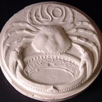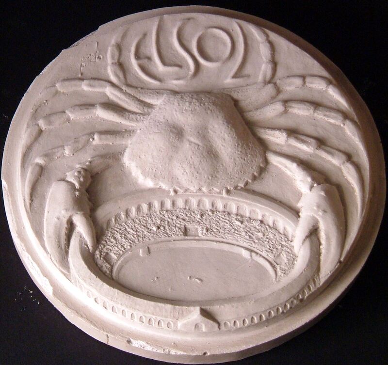 - Molde de escayola del positivo de una medalla que representa a un cangrejo que coge con sus pinzas la estructura de la plaza de toros, y que simboliza el poder envolvente del sol.Serie B Tauromaquia para la Casa de la Moneda. Otros Archivos: MBO/597 MBR/1396