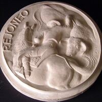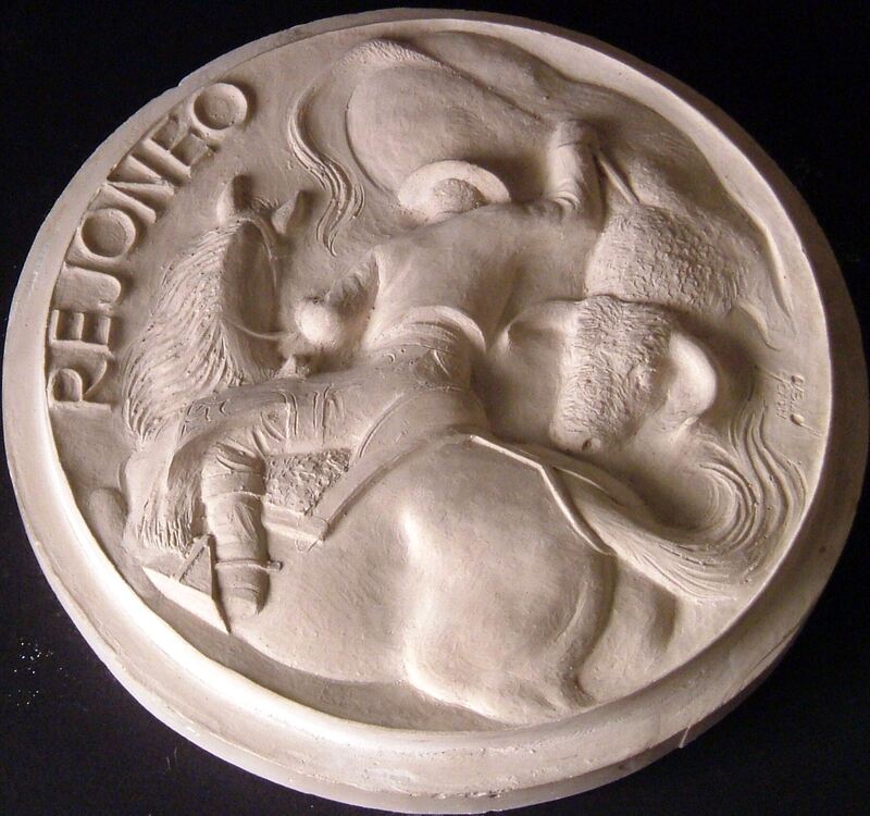 - Molde de escayola del positivo de una medalla donde se aprecia la escena representada desde arriba de un rejoneador clavando las banderillas al toro que se arrima peligrosamente al caballo.