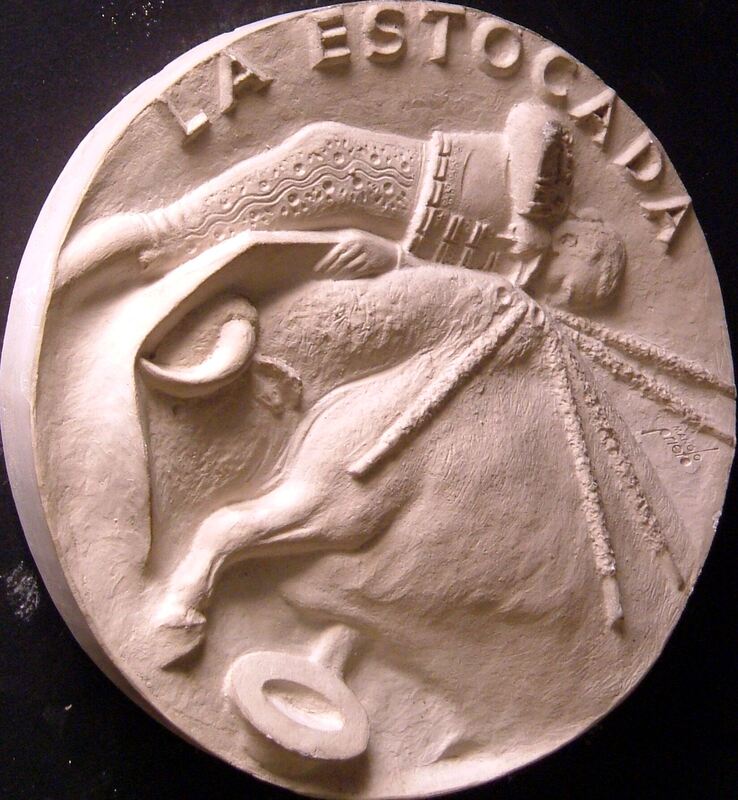 - Molde de escayola del negativo de una medalla que representa la escena taurina de un torero asestando la estocada final al toro. Uno y otro se funden en una sola mole de muerte y vida.