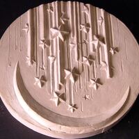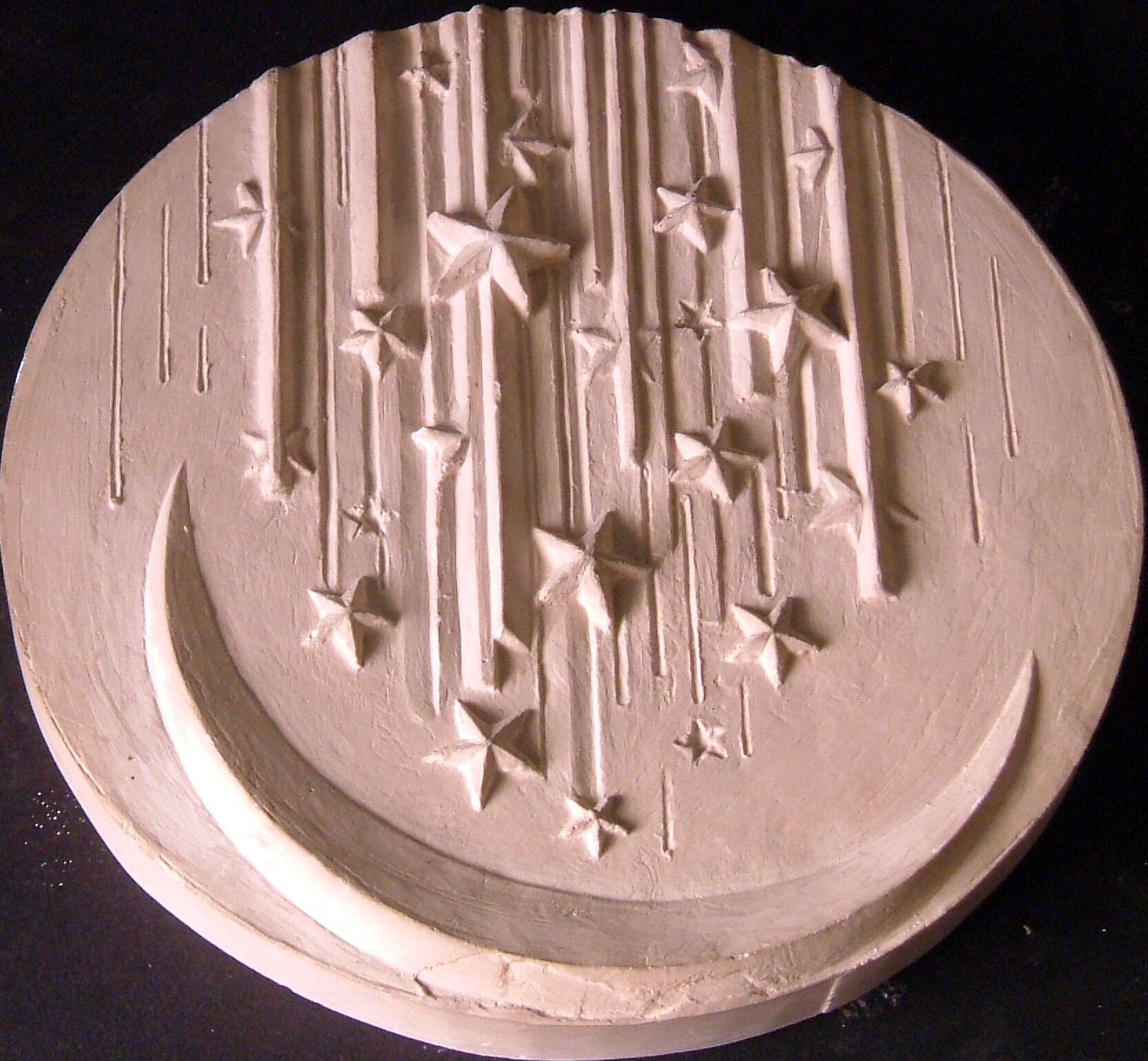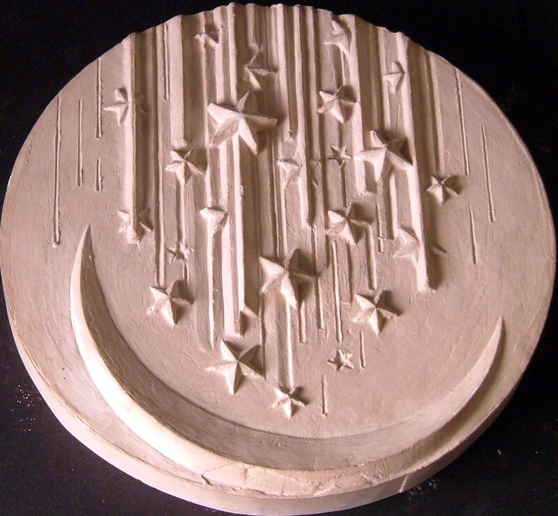 - Molde de escayola del negativo de una medalla que representa a media luna en cuyo interior cae una lluvia de estrellas nocturnas. La imagen tiene una intención claramente simbólica.