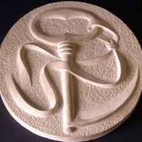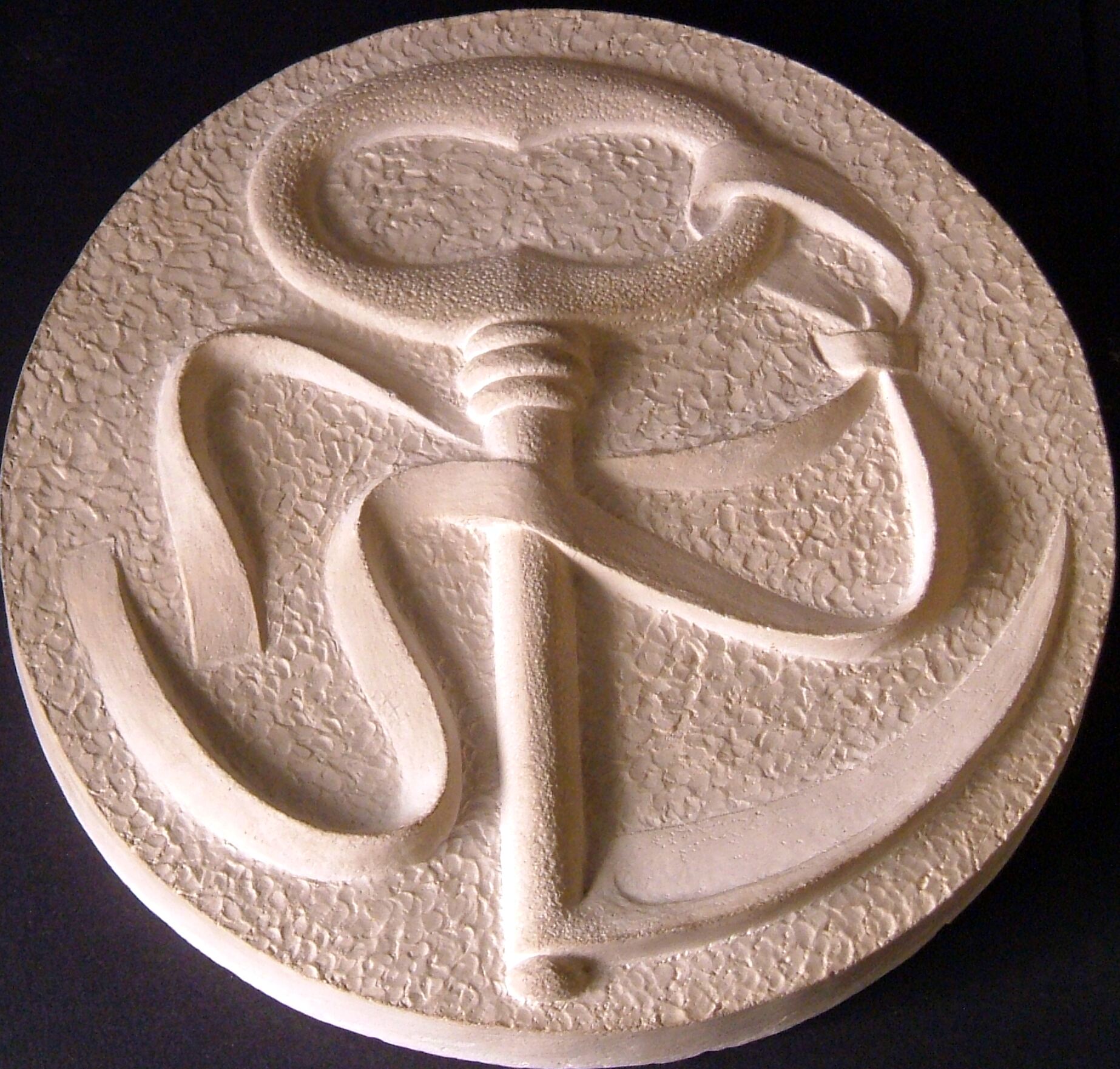 - Molde de escayola del negativo de una medalla que representa en el centro de la superficie una llave, con un cordón atado que vuela alrededor suyo, y que termina en forma de una hoja de hoz.