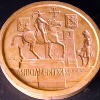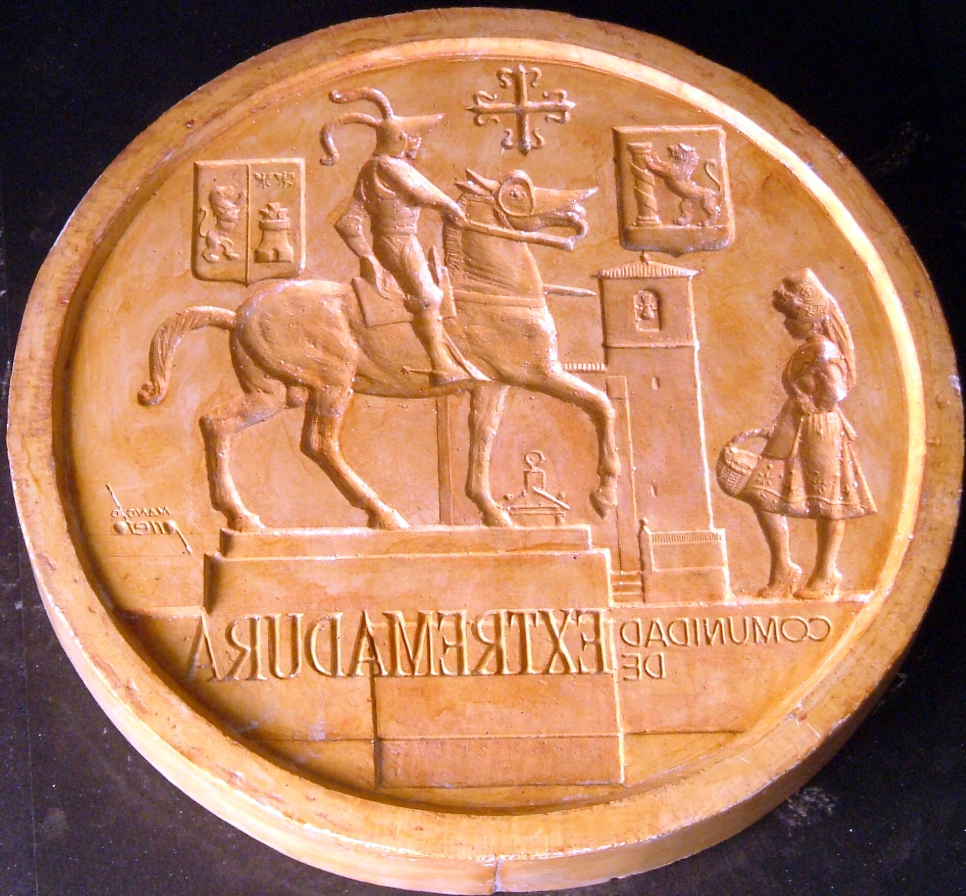 - Molde de escayola del negativo de una medalla de la Comunidad Extremeña representada por Pizarro a caballo junto a la fachada austera de una iglesia, unos escudos, y una mujer vestida con el traje típico de Extremadura.