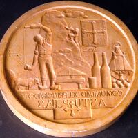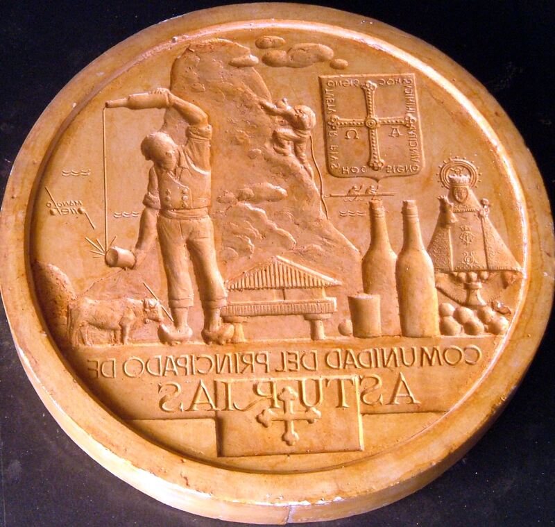 - Molde de escayola del negativo de una medalla de la Comunidad Asturiana representada por elementos y figuras características de ella, en primer término un asturiano con zuecos escanciado sidra, La Virgen de Covadonga, la silueta de una vaca asturiana quedan una magnífica leche y un alpinista subiendo una de montaña.